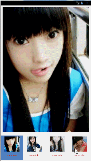 <LinearLayout xmlns:android="http://schemas.android.com/apk/res/android" xmlns:tools="http://schemas.android.com/tools" android:layout_width="match_parent" android:layout_height="match_parent" android:background="@android:color/white" android:orientation="vertical" > <FrameLayout android:layout_width="fill_parent" android:layout_height="0dp" android:layout_weight="1" > <ImageView android:id="@+id/id_content" android:layout_width="fill_parent" android:layout_height="fill_parent" android:layout_gravity="center" android:layout_margin="10dp" android:scaleType="centerCrop" android:src="@drawable/ic_launcher" /> </FrameLayout> <com.example.zhy_horizontalscrollview.MyHorizontalScrollView android:id="@+id/id_horizontalScrollView" android:layout_width="wrap_content" android:layout_height="150dp" android:layout_gravity="bottom" android:background="@android:color/white" android:scrollbars="none" > <LinearLayout android:id="@+id/id_gallery" android:layout_width="wrap_content" android:layout_height="wrap_content" android:layout_gravity="center_vertical" android:orientation="horizontal" > </LinearLayout> </com.example.zhy_horizontalscrollview.MyHorizontalScrollView> </LinearLayout>