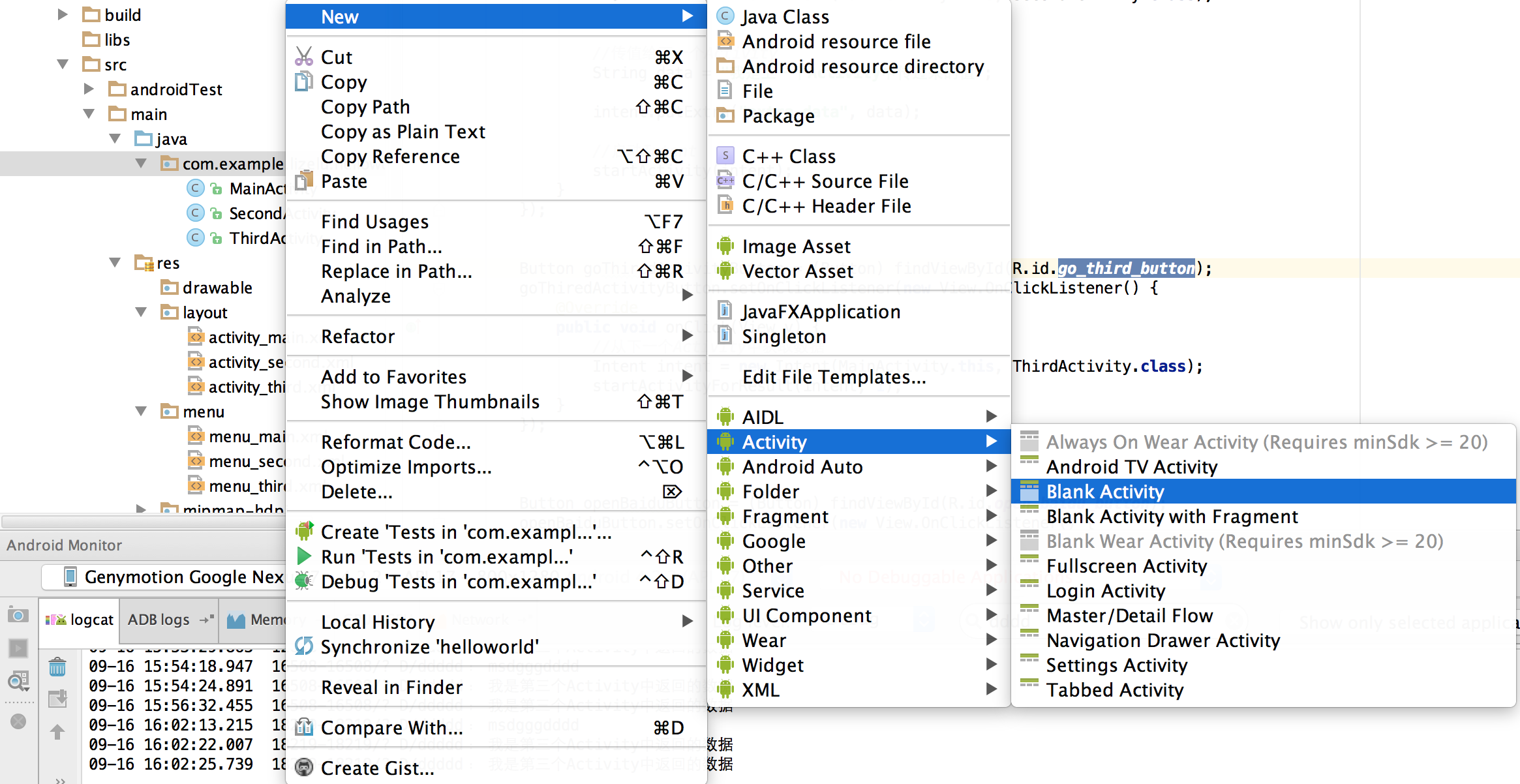在Android Studio的文件資源目錄中,選中你要創建Activity的包,右鍵單擊->New -> Activity ->各種Activity, 在這兒我們選擇Blank Activity,點擊即可,操作如下圖所示。