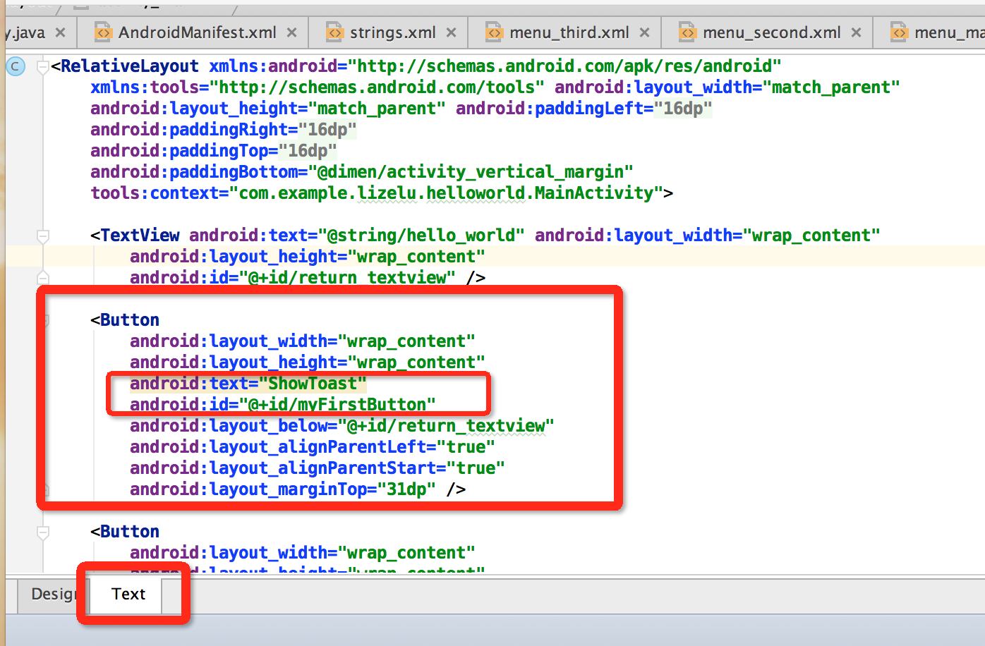 你也可以切換到Text模式下去看xml的文本,下面的大框中就是我們剛才拖拽出來的Button所對應的xml的內容,其中包括與布局有關的信息:控件的寬高,上下左右的邊距等,還有控件的一些屬性:控件獨有的id以及控件顯示的文本(Text)等。當然如果對xml布局的屬性較為了解,就可以使用純代碼去聲明和布局你的控件。