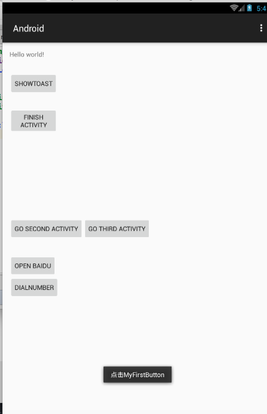 經過上面的步驟,點擊ShowToast按鈕就會提示“點擊MyFirstButton”的內容,下方是執行的結果截圖: