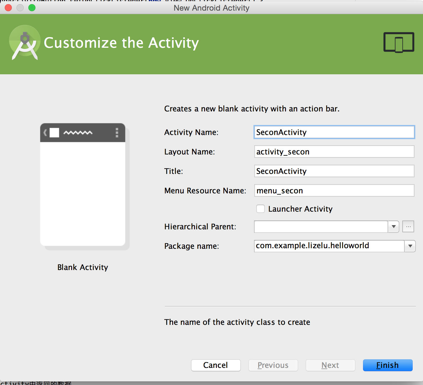 點擊完後出現下面的對話框來新建一個Activity,也就是我們自定義的Activity。Activity Name: 活動的名字,Layout Name: 活動對應布局文件的名字,Titile: 上面導航條顯示的名字。Menu Resource Name: 菜單的xml配置文件的名稱(稍後會詳細介紹),點擊Finishi即可。
