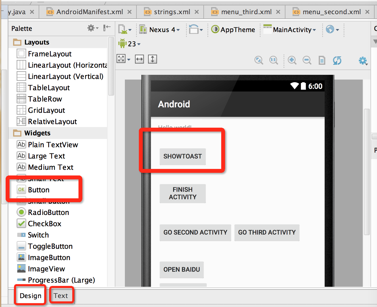 打開activity_main.xml布局文件, 切換到Design模式下,在Design模式下你可以以拖拽的方式來創建控件,以及定位控件。下方是添加了一個Button, 並且Button上的Text為ShowToast(Toast是安卓中顯示信息用的組件)。
