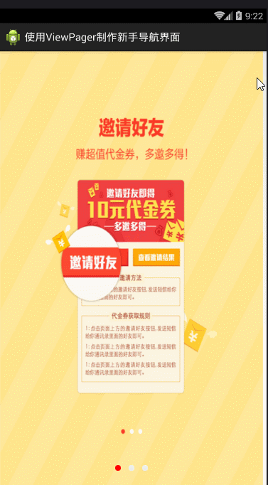 我們來講個老生常談的話題,估計大家都用過的—>ViewPager,用它來做新手導航頁面,雖然這次也是講這個,但是和以往的用法可能有些不同,大家都看到標題進來的,應該知道的是:動態加載指示器。
