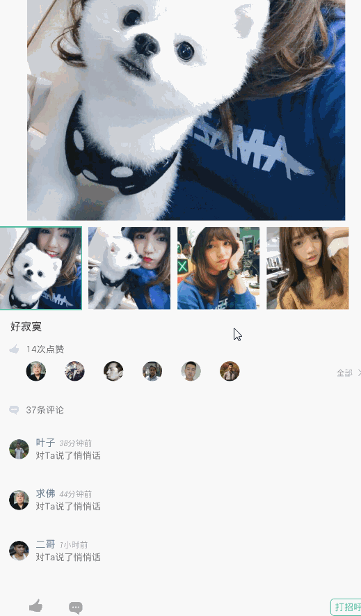 最近在玩一個叫“約會吧”的應用,也是在看直播app,默認下載安裝的,安裝點進去看這個應用做的不錯,就留下來了。然後看他們動態詳情頁底部有一個效果:Recyclerview滑動到的評論列表的時候,底部點贊那欄會往左滑動,出現一個輸入評論的欄;然後下拉到底部的時候輸入評論欄會往右滑動,出現點贊欄。詳細細節直接來看效果圖吧。