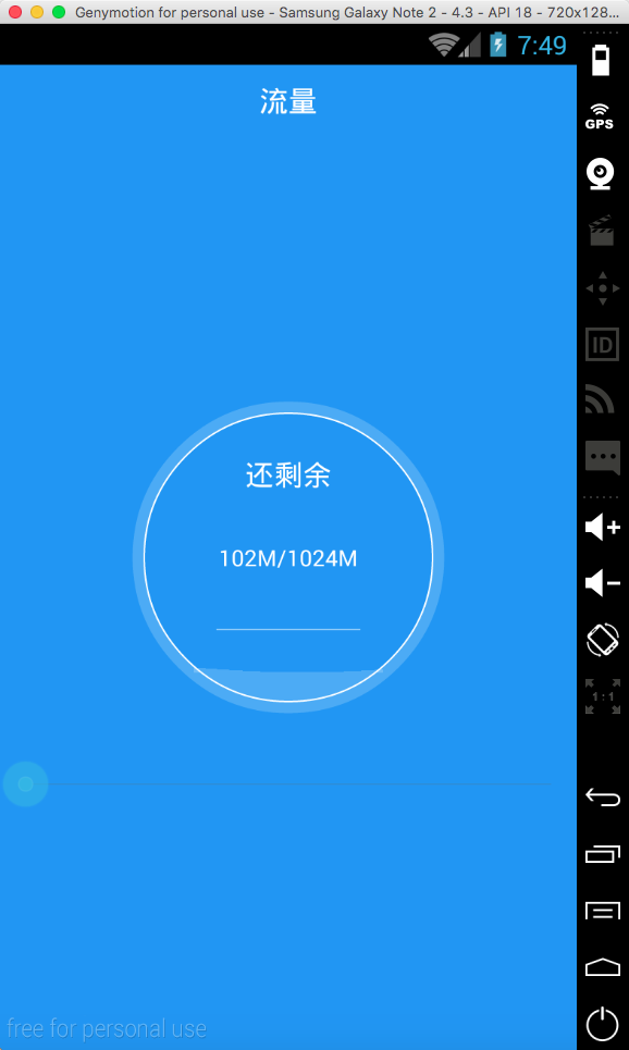 <?xml version="1.0" encoding="utf-8"?> <RelativeLayout xmlns:android="http://schemas.android.com/apk/res/android" xmlns:tools="http://schemas.android.com/tools" android:layout_width="match_parent" android:layout_height="match_parent" android:background="@color/main_bg" > <TextView android:layout_width="wrap_content" android:layout_height="wrap_content" android:layout_alignParentTop="true" android:layout_centerHorizontal="true" android:layout_marginTop="10dp" android:text="流量" android:textColor="@android:color/white" android:textSize="18sp" /> <com.lgl.circleview.CircleView android:id="@+id/wave_view" android:layout_width="fill_parent" android:layout_height="fill_parent" android:layout_centerInParent="true" /> <TextView android:id="@+id/power" android:layout_width="wrap_content" android:layout_height="wrap_content" android:layout_centerInParent="true" android:textColor="@android:color/white" /> <SeekBar android:id="@+id/seekBar" android:layout_width="match_parent" android:layout_height="wrap_content" android:layout_alignParentBottom="true" android:layout_marginBottom="150dp" /> </RelativeLayout>