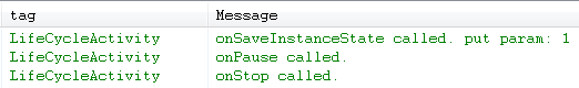 我們看到,此時onSaveInstanceState方法在onPause之前被調用了,並且注意,退居後台時,onPause後onStop相繼被調用。