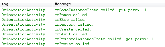 為了避免這樣銷毀重建的過程,我們需要在AndroidMainfest.xml中對OrientationActivity對應的<activity>配置android:configChanges="orientation",然後我們再測試一下,我試著做了四次的旋轉,打印如下: