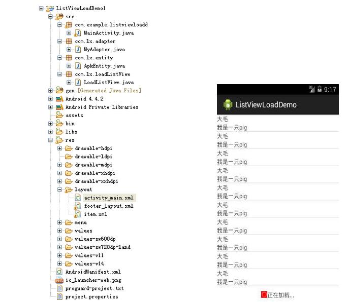 要實現下面的效果--當拖動ListView到底部的時候,顯示一個ProgressBar和一個"正在加載..."的TextView。並且過兩秒鐘後,在下面加載出新的數據。項目的目錄結構和程序要實現的效果如下:
