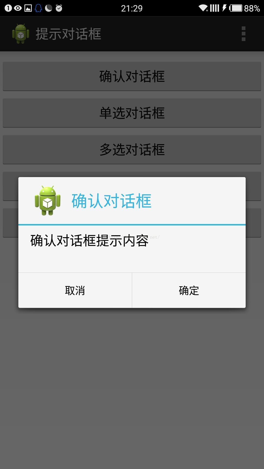 builder.setMessage("確認對話框提示內容");//設置內容