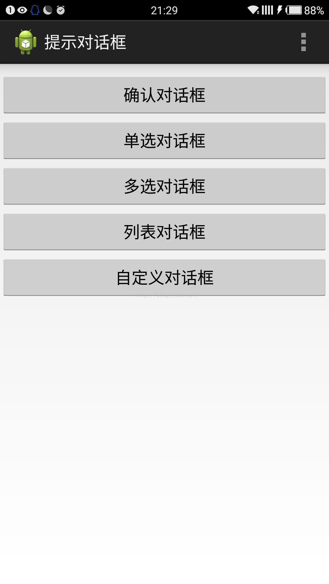 程序運行,顯示圖一的幾個按鈕,點擊按鈕分別顯示圖二到圖六的對話框,點擊對話框的某一項或者按鈕,也會顯示相應的吐司輸出。
