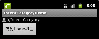 <?xml version="." encoding="utf-"?> <LinearLayout xmlns:android="http://schemas.android.com/apk/res/android" android:orientation="vertical" android:layout_width="fill_parent" android:layout_height="fill_parent" > <TextView android:layout_width="fill_parent" android:layout_height="wrap_content" android:text="測試Intent Category" /> <Button android:id="@+id/Button" android:layout_width="wrap_content" android:layout_height="wrap_content" android:text="轉到Home界面" /> </LinearLayout>