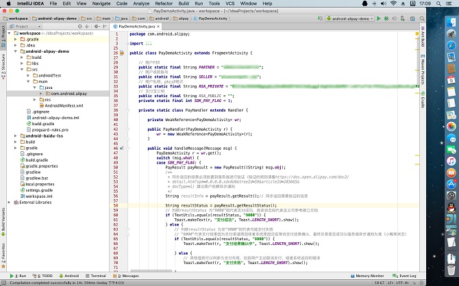 在移動應用滿天飛的時代,隨著移動支付的盛行,很多應用中都集成了支付功能。之前的支付一直不是我負責,近期這個項目我負責訂單模塊少不了要做支付,每每提起支付就覺得怕怕,覺得很難,但當真正做的時候卻遠遠沒有想象中的那麼難。支付寶的SDK提供了demo,我們只需要配置好一些基本信息,這個demo就可以正常支付。說了這麼多,我們還是來看看完整的集成步驟吧!