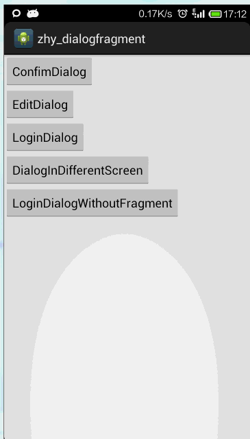 可以看到,對話框成功創建並顯示出來,不過默認對話框有個討厭的標題,我們怎麼去掉呢:可以在onCreateView中調用getDialog().requestWindowFeature(Window.FEATURE_NO_TITLE);即可去掉。即: