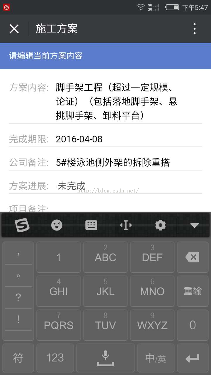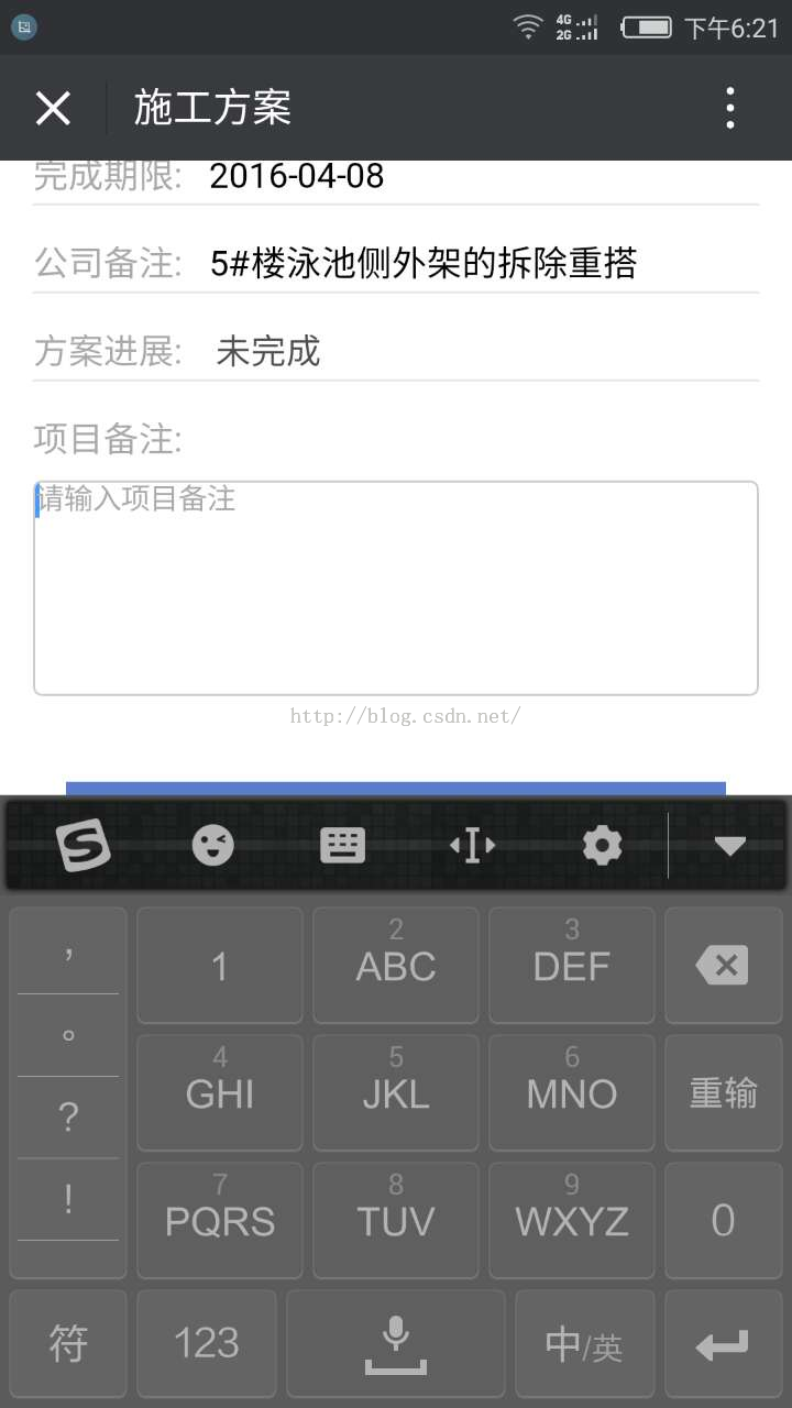 這個頁面剛好一屏幕大小,所以沒有滾動條,因為“保存”鍵上面那個項目備注是需要用戶去填寫的,當他點擊後就會出現虛擬鍵盤,但安卓手機彈出鍵盤會遮住這個輸入框,以至於用戶看不見了。蘋果手機天然不會喔,蘋果手機的鍵盤彈出來是占了下面的位置,從而把頁面推了上去,整個頁面就縮小了就不會出現這樣的情況。安卓手機情況如下圖: