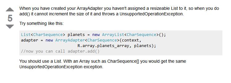 createFromResource(...)調用了ArrayAdapter(Context context, int textViewResourceId, T[] objects)構造方法,而在該方法的內部實現中,android使用Arrays的靜態方法asList(...)將一個數組轉換為List。熟悉Java的程序員都知道,Arrays.asList(...)方法所返回的並不是一個java.util.ArrayList,而是一個Arrays類的內部類,該List實現是不能進行增刪操作的!!(見jdk文檔),對該List進行add將拋出UnsupportedOperationException!