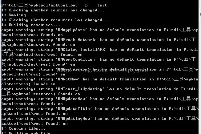如果你想將反編譯完的文件重新打包成apk,那你可以:輸入apktool.bat b test(你編譯出來文件夾)便可,效果如下: