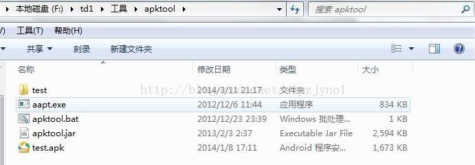 下載上述工具中的apktool,解壓得到3個文件:aapt.exe,apktool.bat,apktool.jar ,將需要反編譯的APK文件放到該目錄下,