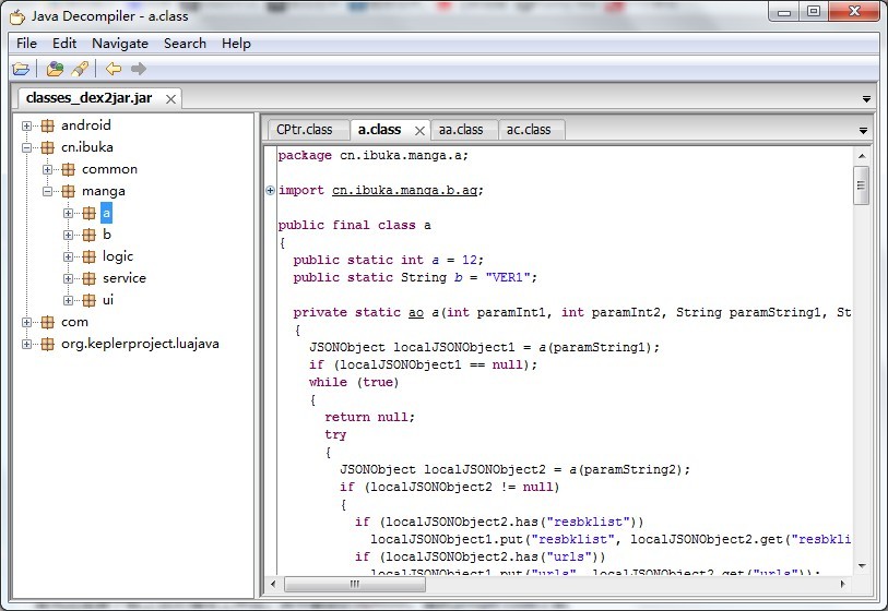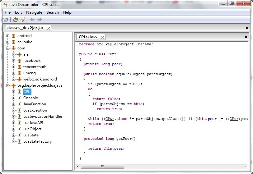 在改目錄下會生成一個classes_dex2jar.jar的文件,然後打開工具jd-gui文件夾裡的jd-gui.exe,之後用該工具打開之前生成的classes_dex2jar.jar文件,便可以看到源碼了,效果如下: