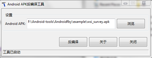 首先,下載上述反編譯工具包,打開Androidfby目錄,雙擊Android反編譯工具.exe,就可以浏覽打開要反編譯的apk