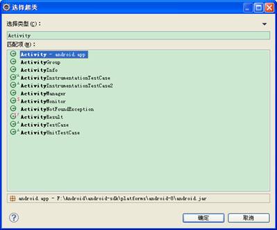 右鍵點擊Eclipse左邊(默認)你要加入Activity的包,比如,我的包是com.INdroid.layout。然後選New->Class,輸入類名後(注意首字母大寫),在Superclass的Browse那裡點擊。最後在Choose a type那裡輸入Activity。然後點OK就可以了