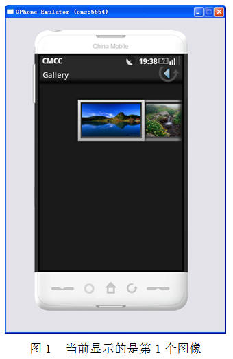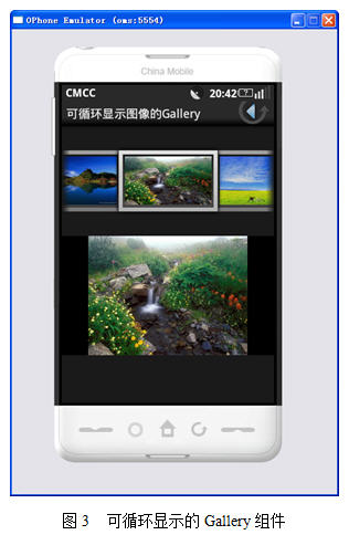 在本節將組出與循環顯示圖像相關的ImageAdapter類的完整代碼。讀者可以從中看到上一節介紹的兩點改進。為了使界面看上去更豐滿,本例還在單擊某一個Gallery組件中的圖像時在下方顯示一個放大的圖像(使用ImageSwitcher組件)。本例的顯示效果如圖3所示。當不斷向後移動圖像時,圖像可不斷顯示,讀者可以自己運行本例來體驗一下。