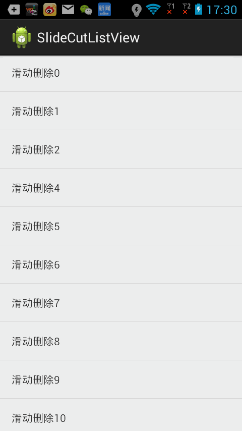這裡來給大家帶來使用Scroller的小例子,同時也能用來幫助初步解除的讀者更加熟悉的掌握Scroller的使用,掌握好了Scroller的使用我們就能實現很多滑動的效果。例如側滑菜單,launcher,ListView的下拉刷新等等效果,我今天實現的是ListView的item的左右滑動刪除item的效果,現在很多朋友看到這個效果應該是在Android的通知欄下拉中看到這個滑動刪除的效果吧,我看到這個效果是在我之前的三星手機上左右滑動打電話發短信的效果,感覺很棒,不過現在很多手機聯系人滑動都不是我之前那台手機的效果啦,網上很多朋友也寫了關於滑動刪除ListView的item的例子,有些是滑動手指離開之後然後給item加向左或者向右的移動動畫,我覺得這樣子的用戶體驗不是很好,所以今天自己也寫了一個關於ListView左右滑動刪除Item的小例子,ListView的item會隨著手指在屏幕上的滑動而滑動,手指離開屏幕的時候item會根據判斷向左或者向右劃出屏幕,就是跟通知欄的效果差不多,接下來就帶大家來實現這個效果。