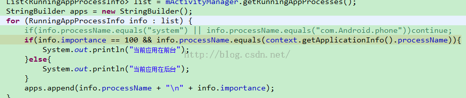 所以這裡要寫成 if(info.importance == RunningProcessInfo.IMPORTANCE_FOREGROUND)