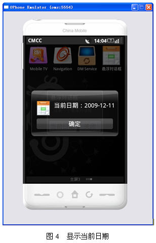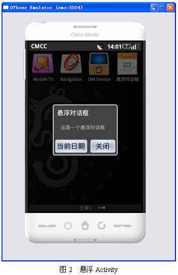當使用上面的配置代碼時,顯示的Activity就會如圖2所示。在本例中向Activity添加了兩個按鈕,分別用來顯示當前日期和關閉對話框。