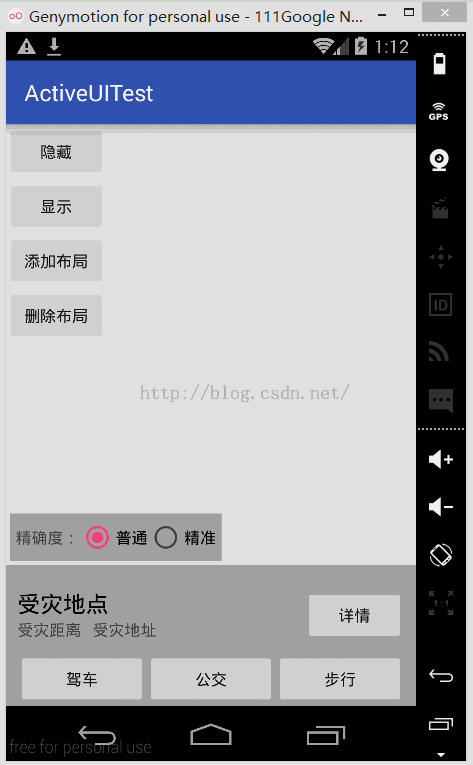 我們可以看到,高德地圖的默認界面與點擊地圖之後的界面是不一樣的,上面同樣的控件在layout中的位置也不一樣,這個用xml便是難以實現的了,於是java動態設置布局便有了其重要性。