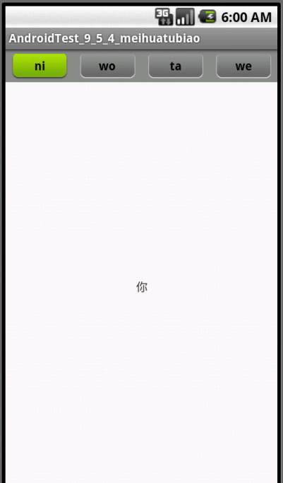 <?xml version="." encoding="utf-"?> <TabHost xmlns:android="http://schemas.android.com/apk/res/android" android:layout_width="fill_parent" android:layout_height="fill_parent" android:id="@+id/tabhost"> <LinearLayout android:id="@+id/linear" android:layout_width="fill_parent" android:layout_height="fill_parent" android:orientation="vertical"> <TabWidget android:id="@android:id/tabs" android:layout_width="fill_parent" android:layout_height="wrap_content"></TabWidget> <FrameLayout android:id="@android:id/tabcontent" android:layout_width="fill_parent" android:layout_height="fill_parent"> <LinearLayout android:id="@+id/tab" android:layout_width="fill_parent" android:layout_height="fill_parent" android:orientation="vertical"> <TextView android:id="@+id/tab_txt" android:layout_width="fill_parent" android:layout_height="fill_parent" android:gravity="center" android:text="你"/> </LinearLayout> <LinearLayout android:id="@+id/tab" android:layout_width="fill_parent" android:layout_height="fill_parent" android:orientation="vertical"> <TextView android:id="@+id/tab_txt" android:layout_width="fill_parent" android:layout_height="fill_parent" android:gravity="center" android:text="我"/> </LinearLayout> <LinearLayout android:id="@+id/tab" android:layout_width="fill_parent" android:layout_height="fill_parent" android:orientation="vertical"> <TextView android:id="@+id/tab_txt" android:layout_width="fill_parent" android:layout_height="fill_parent" android:gravity="center" android:text="他"/> </LinearLayout> <LinearLayout android:id="@+id/tab" android:layout_width="fill_parent" android:layout_height="fill_parent" android:orientation="vertical"> <TextView android:id="@+id/tab_txt" android:layout_width="fill_parent" android:layout_height="fill_parent" android:gravity="center" android:text="我們"/> </LinearLayout> </FrameLayout> </LinearLayout> </TabHost>