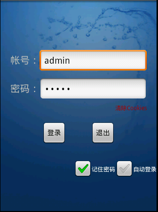 <?xml version="1.0" encoding="utf-8"?> <LinearLayout xmlns:android="http://schemas.android.com/apk/res/android" android:layout_width="fill_parent" android:layout_height="fill_parent" android:gravity="right" android:layout_gravity="right" android:background="@drawable/default_bg" android:orientation="vertical"> <TableLayout android:layout_width="fill_parent" android:layout_height="wrap_content" android:stretchColumns="1"> <TableRow android:gravity="center" android:layout_gravity="center"> <ImageView android:layout_width="fill_parent" android:layout_height="wrap_content" android:id="@+id/ivlogo" > </ImageView> </TableRow> </TableLayout> <TableLayout android:layout_width="fill_parent" android:layout_height="wrap_content" android:stretchColumns="1"> <TableRow android:layout_marginTop="100dip"> <TextView android:layout_width="wrap_content" android:layout_marginLeft="20dip" android:gravity="center_vertical" android:layout_height="wrap_content" android:id="@+id/tvaccount" android:text="帳號:" android:textSize="20sp"> </TextView> <EditText android:layout_width="70px" android:layout_height="wrap_content" android:id="@+id/etaccount" android:layout_marginRight="20dip" android:maxLength="20"></EditText> </TableRow> <TableRow android:layout_marginTop="10dip"> <TextView android:layout_width="wrap_content" android:layout_height="wrap_content" android:id="@+id/tvpw" android:layout_marginLeft="20dip" android:gravity="center_vertical" android:text="密碼:" android:textSize="20sp"> </TextView> <EditText android:layout_width="70px" android:layout_height="wrap_content" android:layout_marginRight="20dip" android:id="@+id/etpw" android:inputType="textPassword"></EditText> </TableRow> </TableLayout> <LinearLayout xmlns:android="http://schemas.android.com/apk/res/android" android:layout_width="wrap_content" android:layout_height="wrap_content" android:orientation="horizontal" android:layout_marginTop="5dip" android:layout_marginRight="20dip"> <TextView android:layout_width="wrap_content" android:layout_height="wrap_content" android:id="@+id/tvclear" android:text="清除Cookies" android:textColor="#aa0000" android:textSize="12px"></TextView> </LinearLayout> <TableLayout android:layout_width="fill_parent" android:layout_height="wrap_content" android:layout_marginTop="20dip"> <TableRow android:gravity="center" android:layout_width="fill_parent"> <Button android:layout_width="100px" android:layout_height="wrap_content" android:id="@+id/btnlogin" android:layout_gravity="center" android:text="登錄"></Button> <Button android:layout_width="100px" android:layout_height="wrap_content" android:id="@+id/btnexit" android:layout_gravity="center" android:text="退出"></Button> </TableRow> </TableLayout> <LinearLayout xmlns:android="http://schemas.android.com/apk/res/android" android:layout_width="wrap_content" android:layout_height="wrap_content" android:orientation="horizontal" android:layout_marginTop="25dip"> <CheckBox android:layout_width="wrap_content" android:layout_height="wrap_content" android:id="@+id/cbrp" android:text="記住密碼" android:textSize="12px"></CheckBox> <CheckBox android:layout_width="wrap_content" android:layout_height="wrap_content" android:id="@+id/cbal" android:text="自動登錄" android:textSize="12px"></CheckBox> </LinearLayout> </LinearLayout>