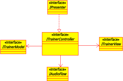 有了前一次設計經驗此次開發使用MVP、模塊化、面向接口等概念,將整個訓練器分為控制器、數據模型、音頻、視圖、可訓練對象五個模塊分別用以下接口表示: