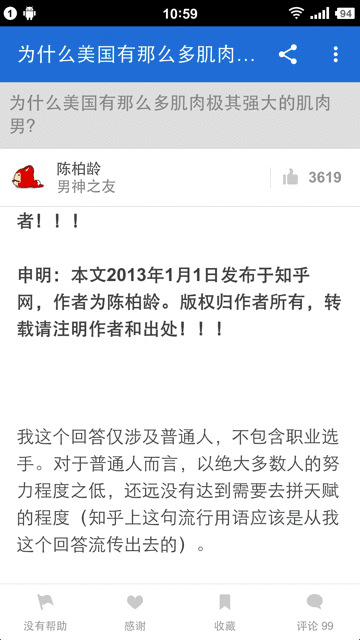 對了,為了更大范圍的現實文本,“知乎”的WebView是占據整個布局的,其他布局都是在根布局FrameLayout裡面,所以,在首次加載的時候,下面的文本在開頭需要留出一定的間隔,防止被遮擋,當上面的布局隱藏之後,就沒有問題了。