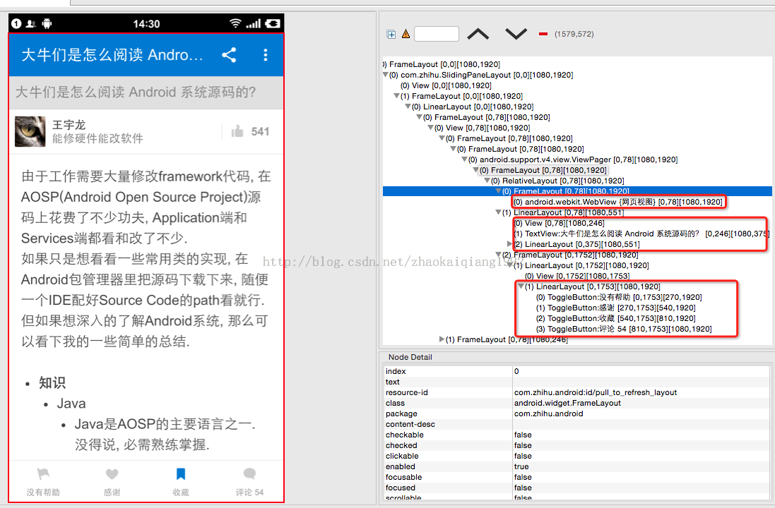 從右邊的分析圖可以看出,知乎的這個界面,內容用的WebView,這很正常,因為用戶的回答裡面格式比較復雜,用WebView是最好的解決方案,而標題欄是一個VIew,是ActionBar還是自定義View呢,不得而知,下面是就是一個LinearLayout包了4個ToggleButton,布局很簡單,我們沒有WebView,所以使用ScrollView代替,上面的布局直接ImageView了,設置個src,模擬一個布局。
