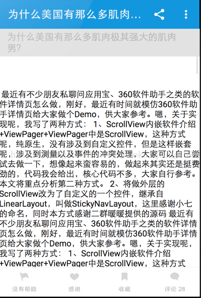 其實是這樣的,為了模擬上部的布局顯示時,Title從Bar下面出現的效果,所以特意這樣設計的。我試過用linearLayout實現,效果也是可以實現的,但是當Title往下移動顯示的時候,會覆蓋在Bar上面,這也很好理解,LinearLayout沒有層次順序,所以會遮擋。我試過View.bringToFront(),試圖把Bar的布局提高層次,但是這樣會導致布局的紊亂,在首次加載的時候,Bar會顯示在最下面,是因為提高層次之後,Bar的布局重新計算,所以不按照LinearLayout的布局規則來了。無奈之下,換成了Framelayout,但是又出現了問題,Bar的高度可以設置,但是Title的高度會隨著文本的增加而改變,這樣一來,最下面Author的布局的位置就不能設置了,因為不知道距離上面多遠,所以我們只能在代碼裡面動態的計算Bar和Title的高度,然後在界面加載的時候,動態的給Author的布局設置MargenTop,保證位置的正確。