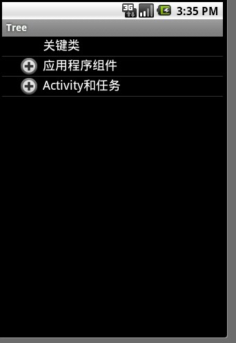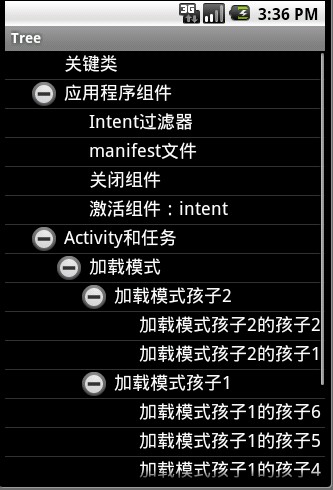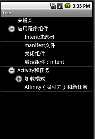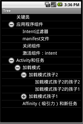 應該說很多的操作系統上面都提供了TreeView空間,實現樹形結構,這個樹形結構的應用時很廣泛的,而Google開發Android的時候出於Android手機是觸摸屏幕的考慮,用手指操作樹形結構很不方便,從這方面考慮沒有提供TreeView的空間,而是只是提供了一個ExpandableListView:android中的二級樹型Widget,雖然已經能滿足不少的功能需求,例如書簽的功能就可以使用這個控件,但是隨著應用的不斷增多這個就不能滿足要求了,例如pdf中左側的目錄的功能,就需要樹形結構來實現。下面的這個應用就是基於pdf左側的目錄結構為原型寫的,那首先貼上效果圖:
