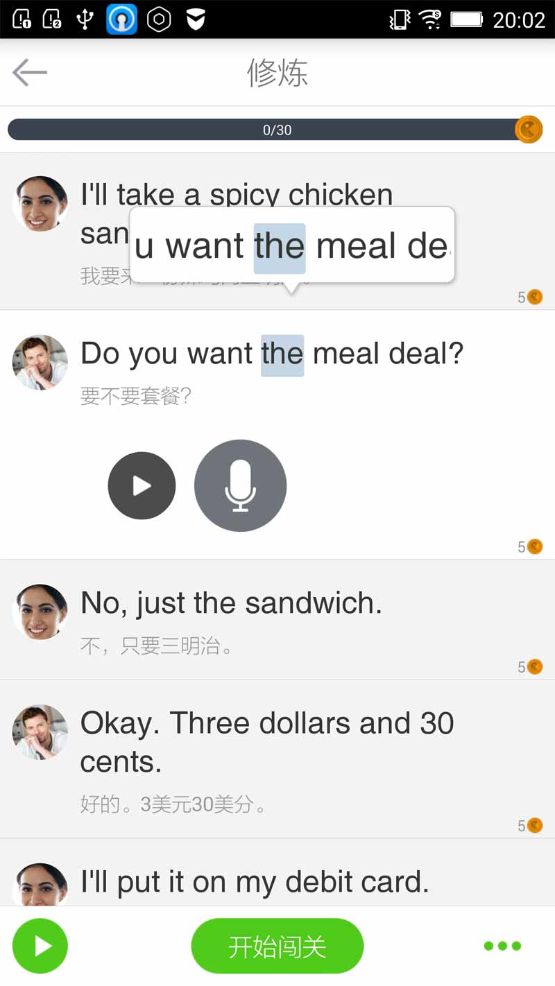 英語流利說是一款非常幫的口語學習app,在app的修煉頁面長按屏幕,會彈出一個放大鏡,當手指移到某個單詞的附近,可以看到該英文單詞會被選中,效果如下圖所示: