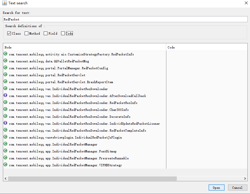 OK,我們找到了十幾條,開始逐一排查,第一條RedPacketInfo點進去一看就是個包含了各種field的ui用的vo類,跳過,再看下一個,從包名com.tencent.mobileqq.data看上去,似乎有戲,QQWalletRedPacketMsg: