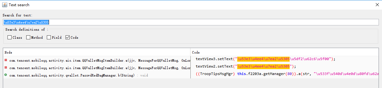 我們再次使用關鍵詞redtype進行搜索,這次選擇Code,只進行代碼內搜索,結果卻發現貌似不對,找到相關的字符串是”查看詳情”,貌似是描述紅包領取狀態的。