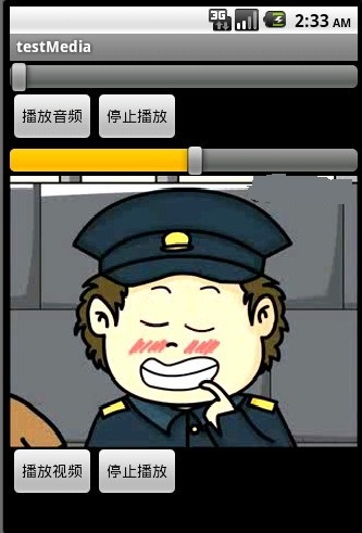先貼出本文程序運行結果的截圖,上面是播放/停止音頻,可用SeekBar來調進度,下面是播放/停止視頻,也是用SeekBar來調進度: