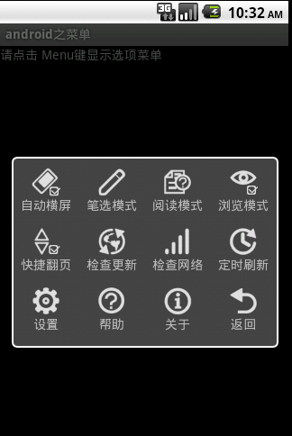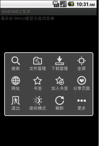 默認樣式是在屏幕底部彈出一個菜單,這個菜單我們就叫他選項菜單OptionsMenu,一般情況下,選項菜單最多顯示2排每排3個菜單項,這些菜單項有文字有圖標,也被稱作Icon Menus,如果多於6項,從第六項開始會被隱藏,在第六項會出現一個More裡,點擊More才出現第六項以及以後的菜單項,這些菜單項也被稱作Expanded Menus。下面介紹。