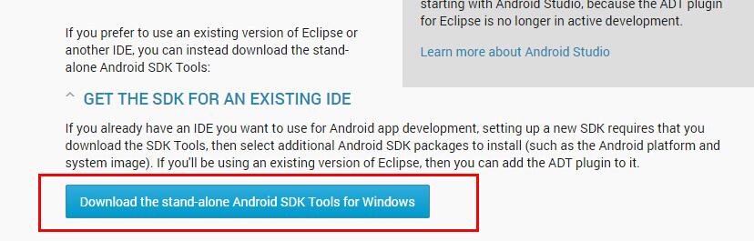配置了JDK變量環境,安裝好了Eclipse,這個時候如果只是開發普通的JAVA應用程序,那麼Java的開發環境已經准備好了。我們要通過Eclipse來開發Android應用程序,那麼我們需要下載Android SDK(Software Development Kit)和在Eclipse安裝ADT插件,這個插件能讓Eclipse和Android SDK關聯起來。