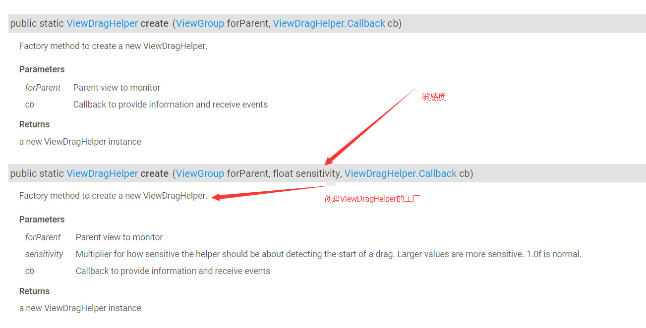 我們可以知道,ViewDragHelper是通過create()方法構造出來。這個在後面會有詳細介紹。