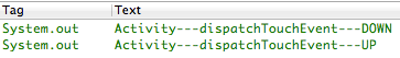 接著,將上述修改還原,讓事件在Activity這繼續往下分發,接著就分發到了RTButton,將RTButton的dispatchTouchEvent方法的返回值修改為true,重新編譯運行並查看輸出日志結果。