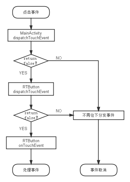 跟分析結果一樣,onClick方法並沒有被執行,因為事件在RTButton的onTouchEvent方法中被消費了。下圖是整個事件傳遞的流程圖。