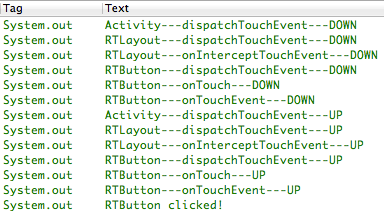 從日志輸出結果我們可以看到,嵌套了RTLayout以後,事件傳遞的順序變成了Activity->RTLayout->RTButton,這也就回答了前面提出的問題,Android中事件傳遞是從ViewGroup傳遞到View的,而不是反過來傳遞的。