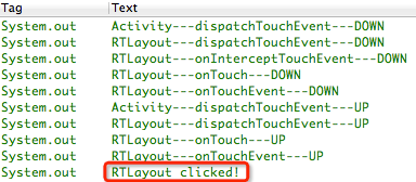 可以看到,我們明明點擊的按鈕,但輸出結果顯示RTLayout點擊事件被執行了,再通過輸出結果分析,對比上次的輸出結果,發現本次的輸出結果完全沒有RTButton的信息,沒錯,由於onInterceptTouchEvent方法我們返回了true,在這裡就將事件攔截了,所以他不會繼續分發給RTButton了,反而交給自身的onTouchEvent方法執行了,理所當然,最後執行的就是RTLayout的點擊事件了。