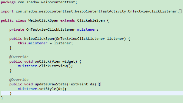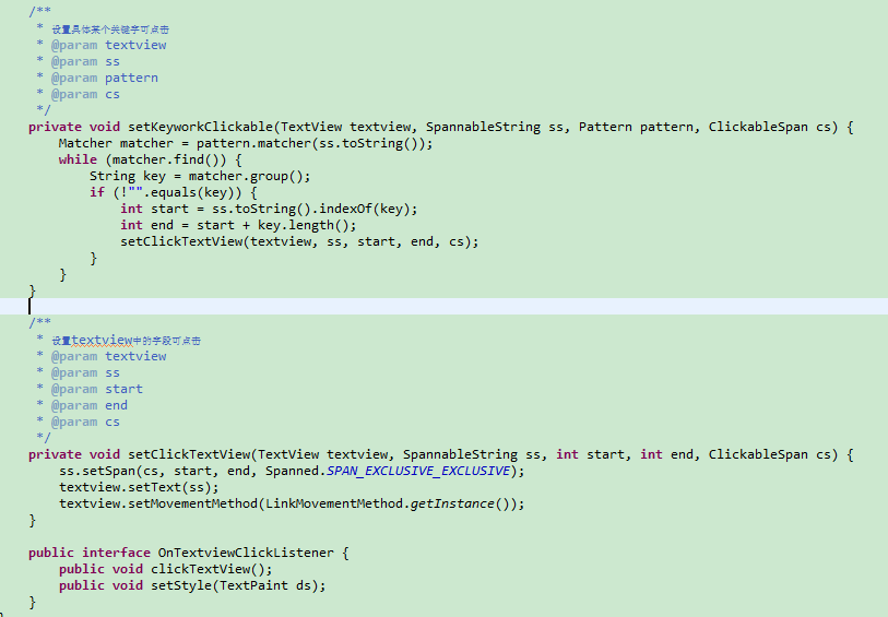 以上就有我們這次需要設置textview可點擊的關鍵方法以及自定義clickspan中要用到的listener