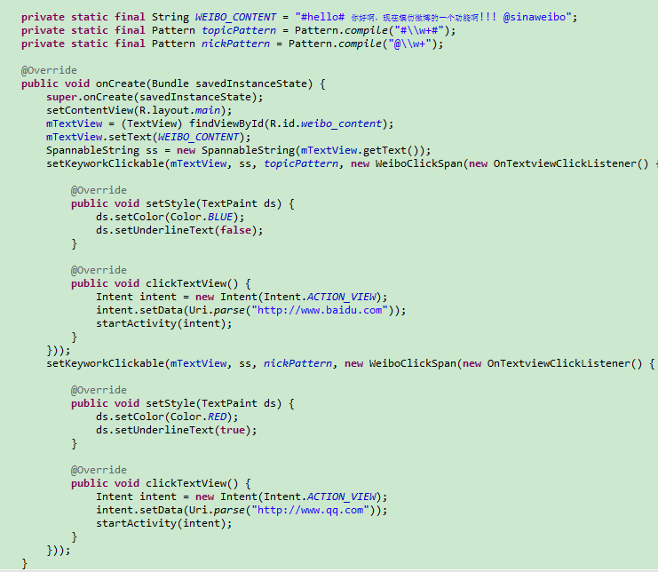 用過微博Android手機端的朋友的都知道微博正文有時有一些高亮顯示的文本,如話題、提到的人等等,當點擊這些文本時會跳到另外一個頁面(即另一個activity),下面就要來模仿微博的這個功能