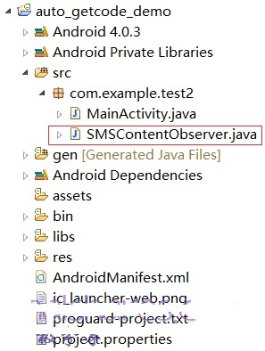 將auto_getcode_demo中src包裡的SMSContentObserver類復制到你的項目src包中